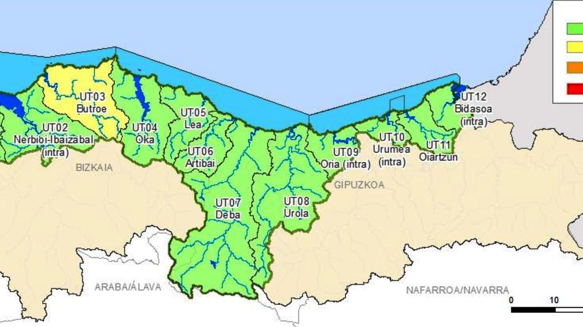 Las cuencas internas de Euskadi tienen en estos momentos la mayor reserva hídrica de todo el Estado, que vive una de las sequías más severas desde que existen registros. Las doce unidades territoriales en las que se divide el mapa hidrológico vasco se encuentran en verde menos Butroe, en amarillo. Busturialdea se encuentra en estado de “sequía moderado” por lo que el Consorcio de Aguas Bilbao Bizkaia ha pedido a los 16 ayuntamientos que componen la comarca –que en verano multiplica su población– que comiencen a limitar el uso del agua a actividades esenciales.