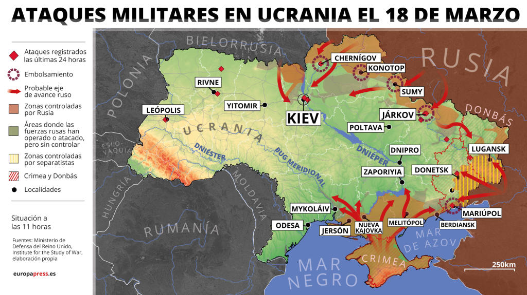 El Instituto para la Guerra (ISW) ha confirmado que una serie de contraataques ucranianos han evitado los intentos de las tropas del Kremlin por cercar Kiev, que sigue resistiendo. También resiste Mikolaiv, en el sur, mientras que Járkov, Chernígov, Sumi y Mariupol siguen sitiadas y recibiendo bombardeos constantes.