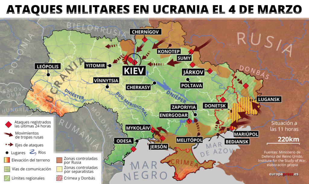 Desde Chernígov y Sumi, las tropas del Kremlin tratan de acercarse a Kiev, donde la resistencia ucraniana está evitando que caiga la capital. En el este se han registrado bombardeos en Járkov, la segunda ciudad del país. Y en el sur es donde más han logrado avanzar los rusos. Se acercan a Odesa, tienen rodeada Mariupol y asedian Zaporiyia, donde se encuentra la central nuclear más grande del país.