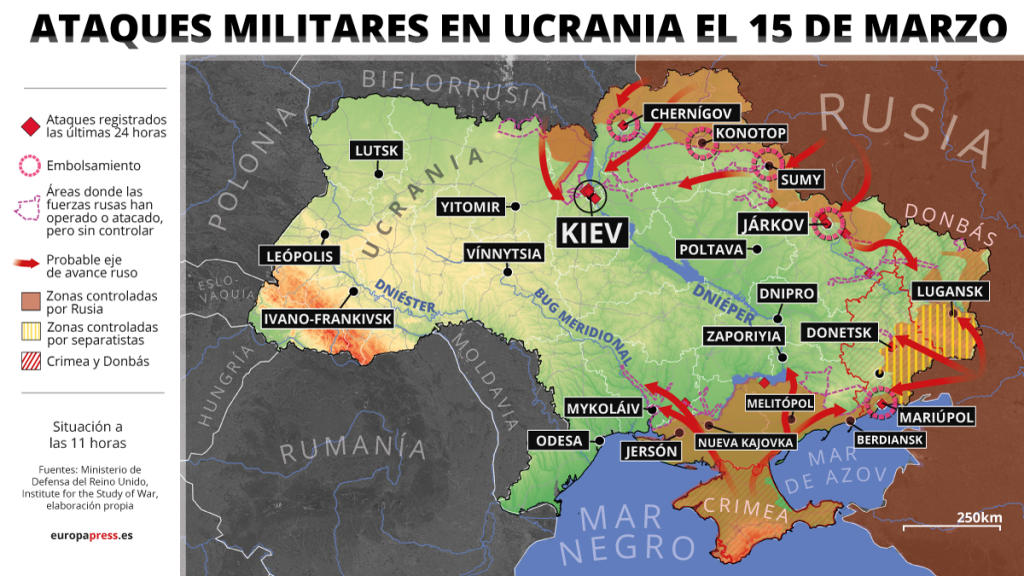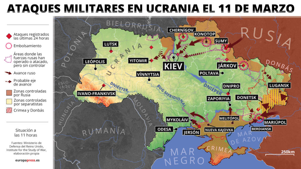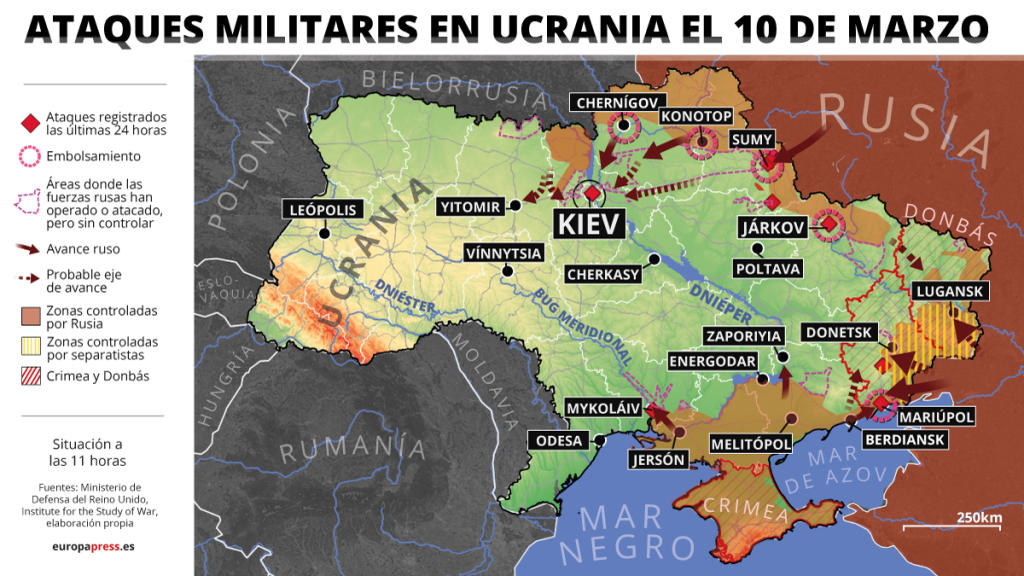 Las tropas rusas han logrado tomar de madrugada la estratégica ciudad de Jersón y avanza hacia Mikoláiv, que ya está siendo atacada, y Odesa, el principal puerto ucranio en el mar Negro. Asimismo, continúa el asedio a Mariupol y a Járkov, donde la resistencia ucraniana está siendo muy dura