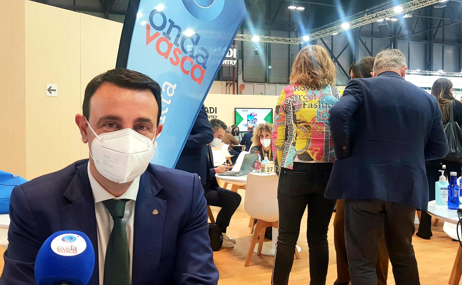 Mikel Torres, Alcalde de Portugalete comenta en el stand de Onda Vasca en Fitur que el fin de semana del 11 de junio entre otros actos, habrá una recepción teatralizada a María Díaz de Haro otorgando la carta puebla y llegando por la ría.
