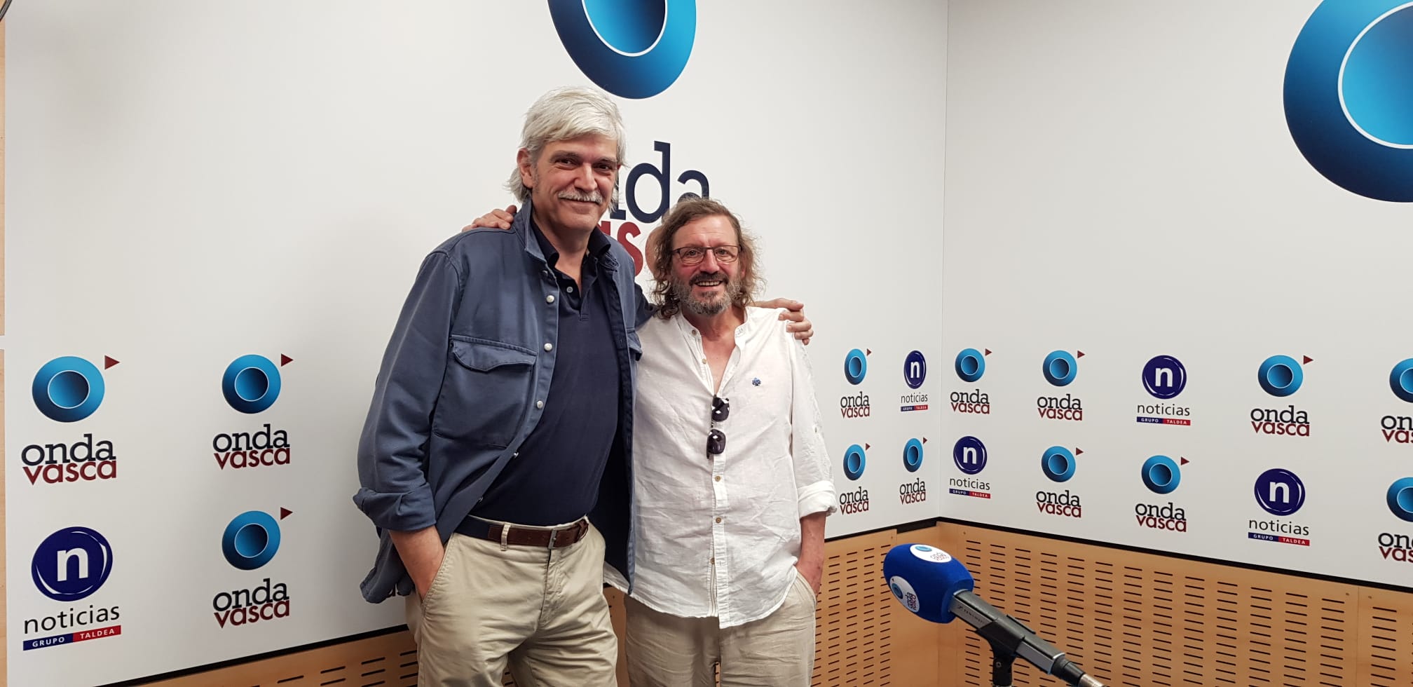 Jose Fernández de la Sota, Director de la Fundación Blas de Otero (izquierda) y Javier Arnaiz, Portavoz de la Plataforma Ciudadana 29 de junio, se acercan a los estudios de Onda Vasca para presentar el acto en recuerdo del poeta bilbaíno autor de "Pido la paz y la palabra".