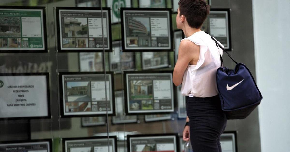 Una joven, ante el escaparate de una inmobiliaria con ofertas de pisos en venta y alquiler.