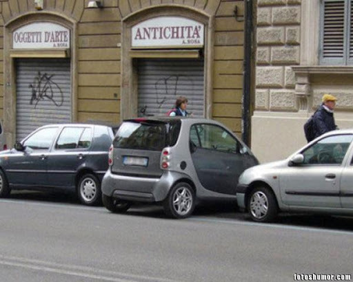 A pesar de que muchos propietarios de estos coches pequeños aparcan en batería cuando se trata de un aparcamiento en línea, está prohíbido porque sobresale del borde de la plaza.