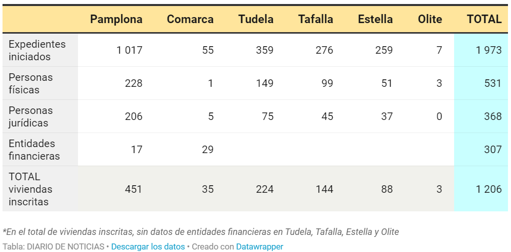 Del total de 1.206 de Navarra, 531 pertenecen a personas físicas, 368 de personas jurídicas y 307 de entidades financieras. Obviamente, hay, en definitiva, identificadas más viviendas vacías (por medio de diferentes indicios de deshabitación), pero estas 1.206 están ya en el registro figuran ya de una manera efectiva, con resolución firme y con todos los efectos jurídicos que ello implica. "Y no es una foto fija", porque el Servicio de Inspección de la Dirección General de Vivienda "sigue trabajando en la detección de vivienda vacía y la apertura de expedientes para seguir completando el censo", precisan desde Vivienda.