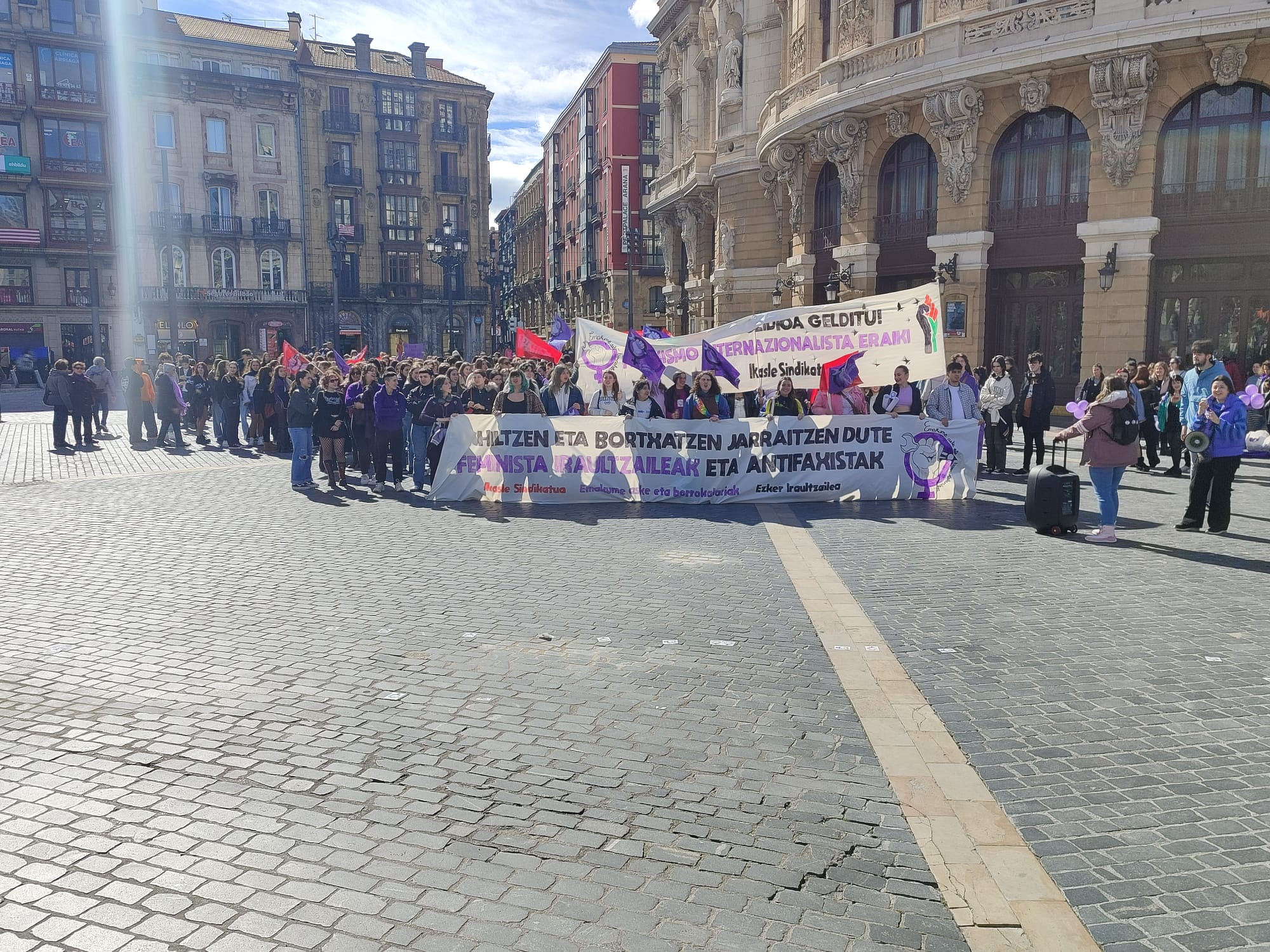 Al grito unánime de "Gora Borroka Feminista" "Fuera machismo de nuestras aulas", "Luego diréis que somos cinco o seis" o "Abascal es un criminal" y apoyando al "pueblo Palestino por el genocidio que está sufriendo", la marcha estudiantil ha partido a las doce del mediodía de la Plaza Arriaga de Bilbao, recorriendo Gran Vïa, Jardines de Albia, y volviendo a la plaza Arriaga por el Arenal. En la pancarta en la cabecera se podía leer en euskera: "Nos siguen matando y violando. Basta ya'.