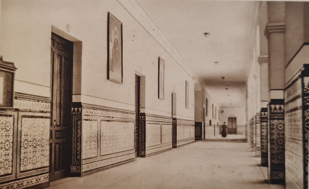 Imagen de los años 40 de los pasillos que rodean los claustros del colegio.