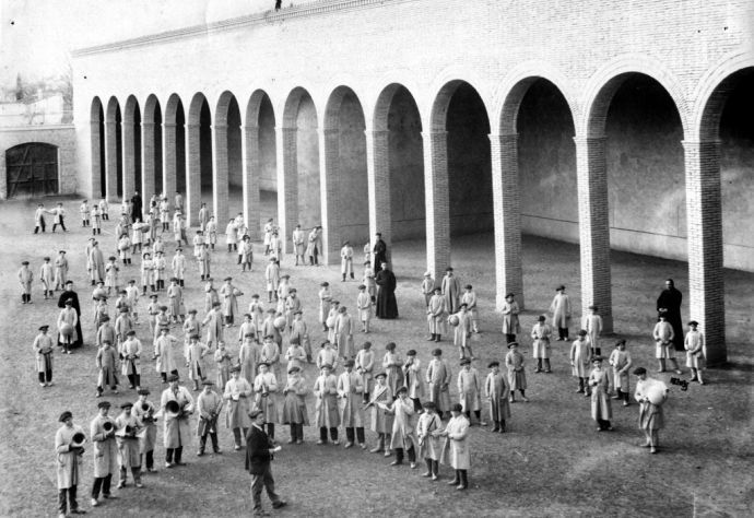 Imagen de los alumnos del colegio de Jesuitas de Tudela en el patio central a finales del siglo XIX.