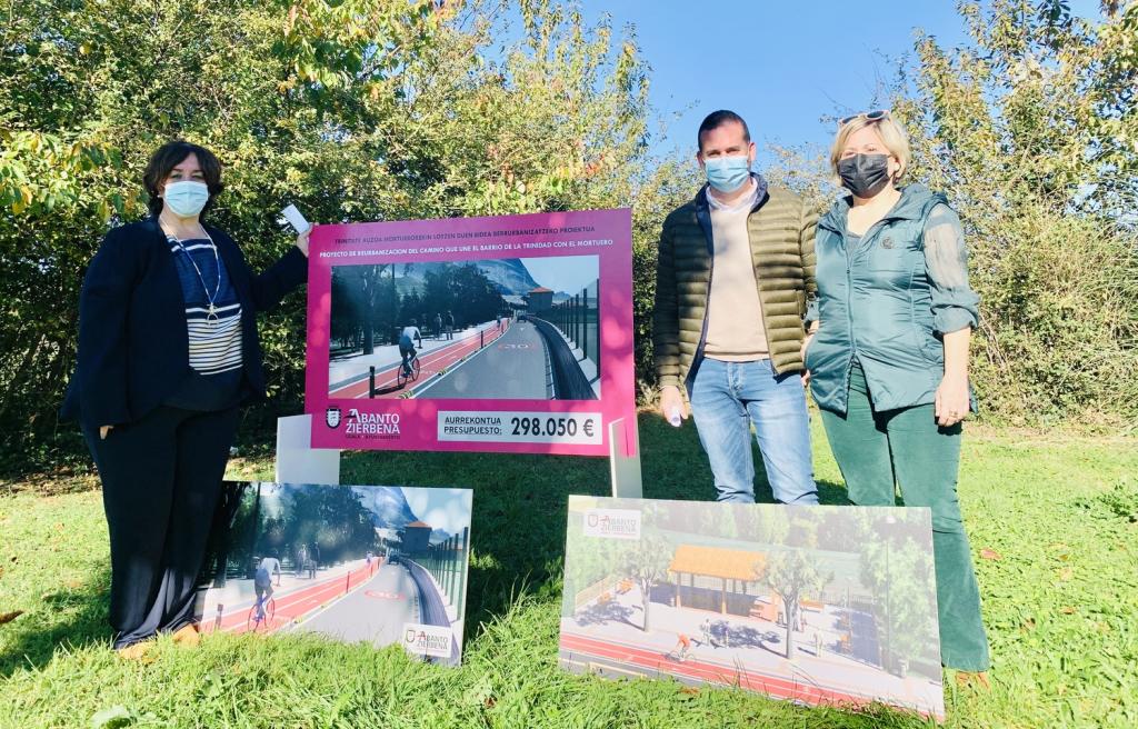 Maite Etxebarria, Jon Cuesta y Maitane Martínez. Las características principales de esta actuación que mejorará la conexión de los barrios de Murrieta, San Pedro, Gure Etxea y Maria Auxiliadora, pasan por la creación de un carril de sentido único para los coches desde el barrio La Trinidad –colocándose nueva señalética y un nuevo asfalto semipeatonal para disminuir la velocidad– y por la construcción de una acera de 300 metros de longitud con 2 metros de ancho y la colocación de una pérgola cubierta de madera de 8x5 metros con cerramiento de las dos fachadas noroeste con vidrio laminar. Una ruta peatonal segura que contará con un nuevo alumbrado led, reduciendo la contaminación lumínica y colocando mayor número de luminarias en todo el vial, logrando una mayor seguridad de las personas que transcurran por el camino de noche.