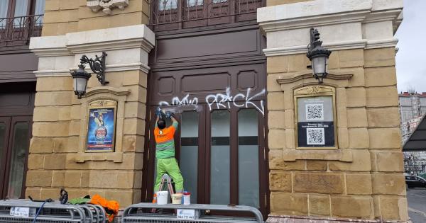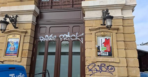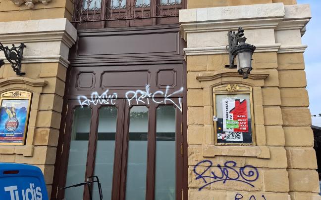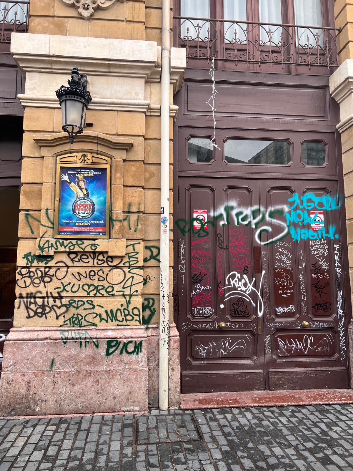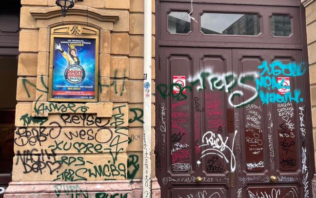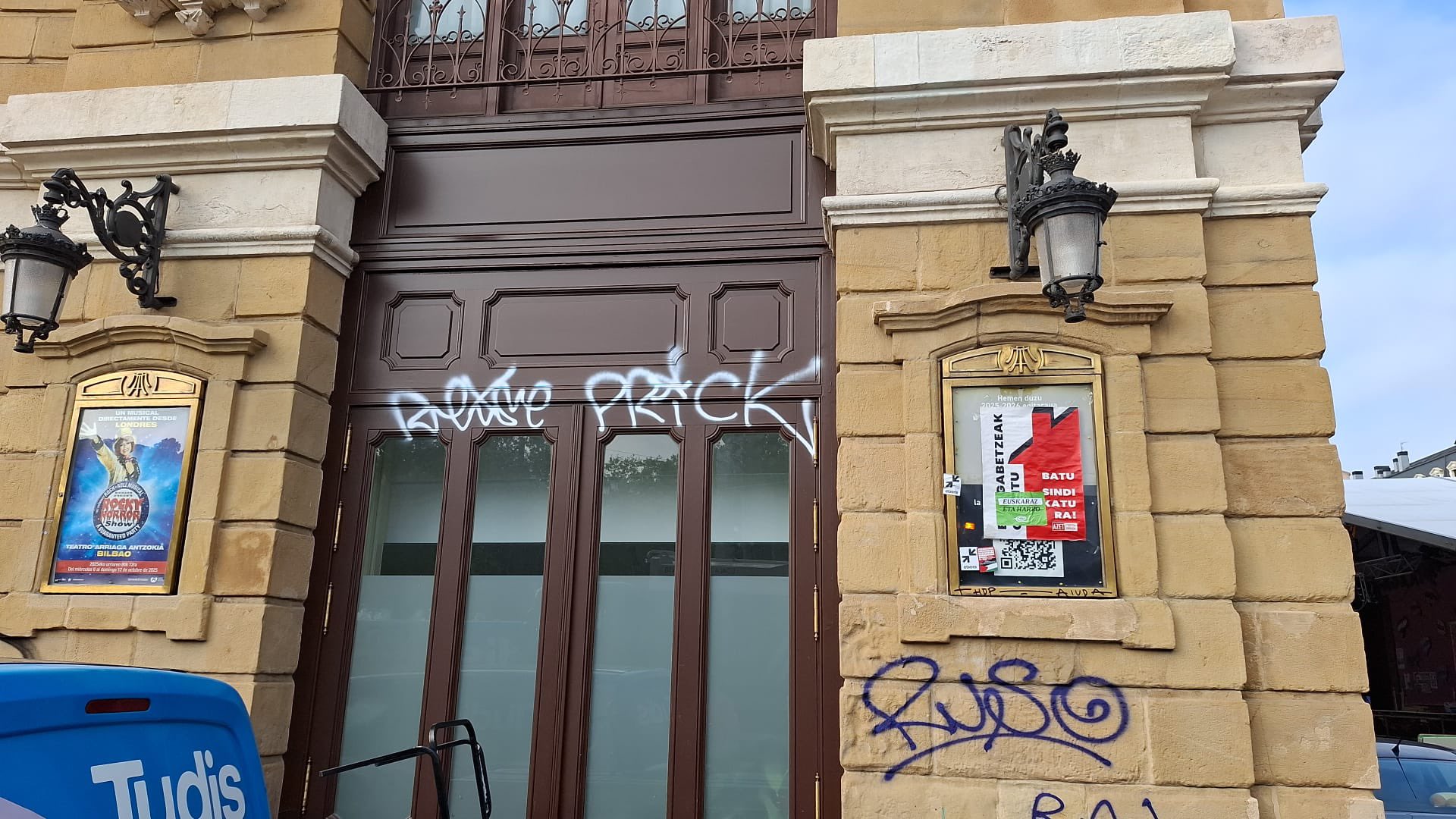 A través de sus redes sociales el alcalde de Bilbao, Juan Mari Aburto, ha calificado de "inaceptable ataque al patrimonio cultural de la ciudad", las pintadas que desconocidos han realizado este fin de semana, durante la pasada Aste Nagusia, tanto en la piedra, zócalo como las puertas del Teatro Arriaga.