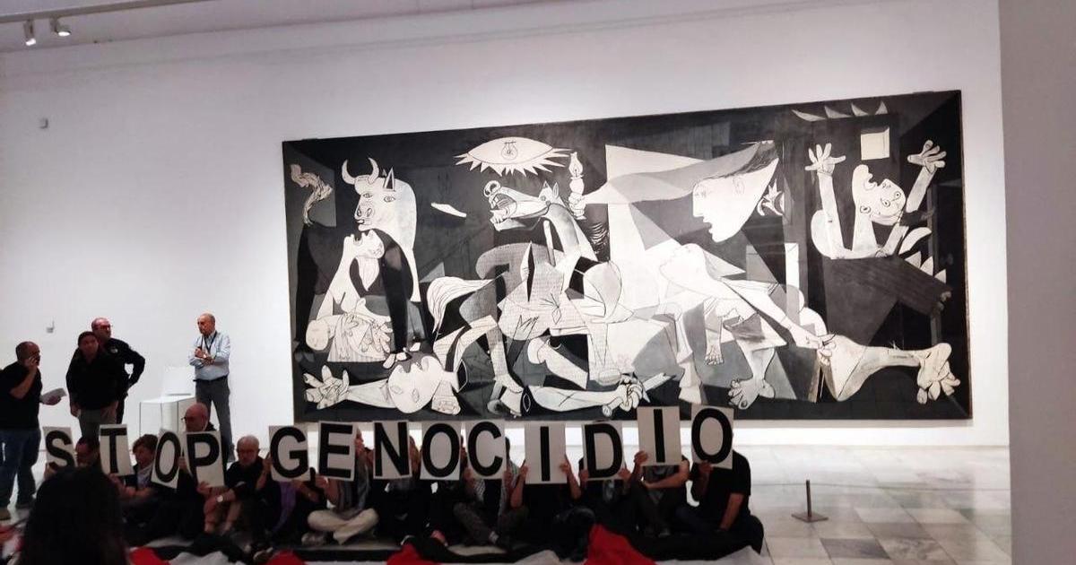 "Mientras se celebra la 'Fiesta Nacional de España' con un desfile militar en un contexto de rearme y escalada bélica mundial, desde Marea Palestina hemos elegido la sala del 'Guernica' para expresar nuestra exigencia de detención del genocidio contra el pueblo palestino", ha denunciado el colectivo en un comunicado.