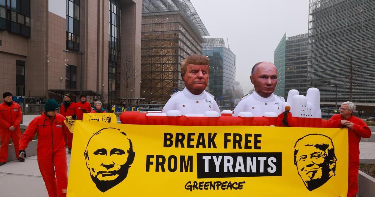"Libérense de los tiranos" ha clamado la organización ecologista en una pancarta con la que exigen a los Estados miembro de la UE, que han dado luz verde este viernes a la prohibición progresiva de la importación de gas ruso desde 2027, que sustituyan los combustibles rusos por energía renovables y no por gas proveniente de Estados Unidos.