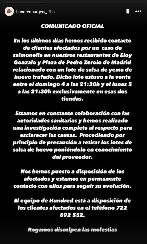 La cadena de hamburgueserías ha emitido un comunicado en su página web aclarando lo sucedido y mostrando su total colaboración para solucionar el problema y ayudar a los posibles afectados: "En los últimos días hemos recibido contacto de clientes afectados por un caso de salmonella en nuestros restaurantes de Eloy Gonzalo y Plaza de Pedro Zerolo de Madrid relacionado con un lote de salsa de yema de huevo trufado. Dicho lote estuvo a la venta entre el domingo 4 a las 21:30 horas y el lunes 5 a las 21:30 horas exclusivamente en esas dos tiendas".