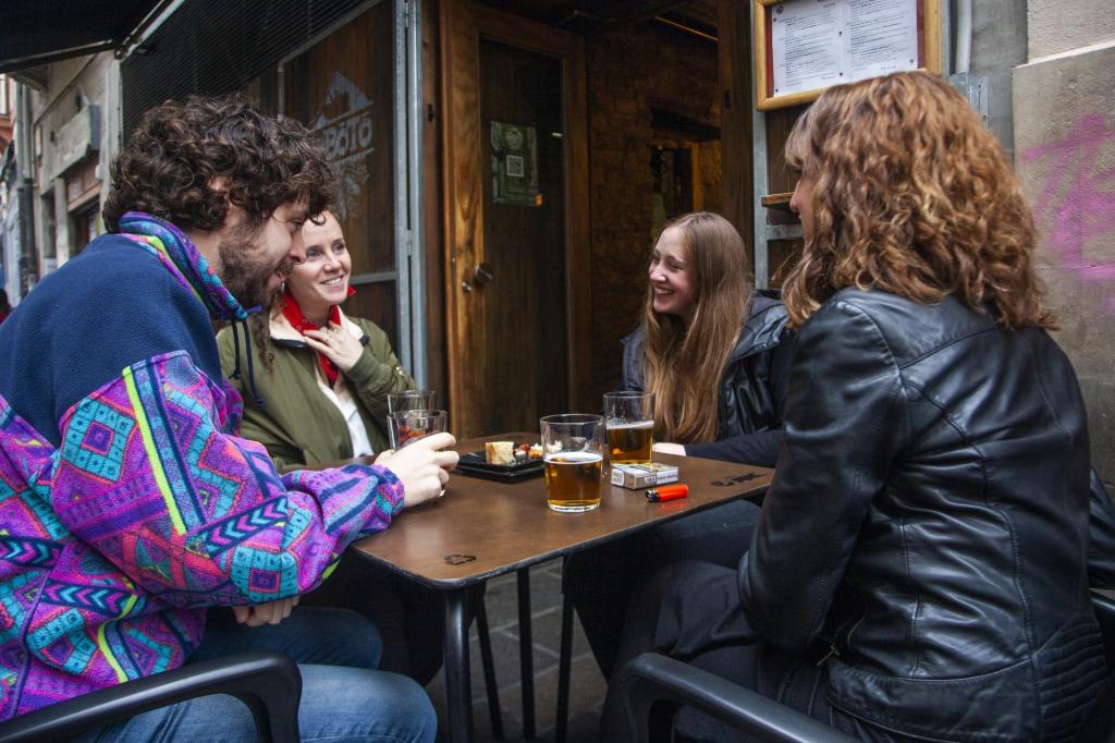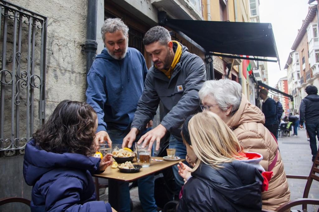 Las consumiciones van y vienen del interior a la calle y, viceversa, en manos de sonrientes clientes encantados de retomar el poteo por el Casco Viejo. Muchos echaban de menos consumir en barra, hartos ya de tener que pillar mesa libre y permanecer sentado en una silla de terraza. "Al final, bebes más, sobre todo cuando había hora de cierre, porque estabas pensando, venga, otra, antes de que chapen", apunta Mario delante de su "segunda" Voll-Damm.