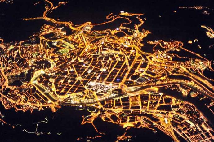 Gorka Belamendia, coordinador del Centro de Interpretación de los humedales de Salburua y Alberto Ancín, secretario de la Sociedad Astronómica de Alava hablan de la contaminación lumínica a raíz de la exposición que tiene lugar en Ataria.