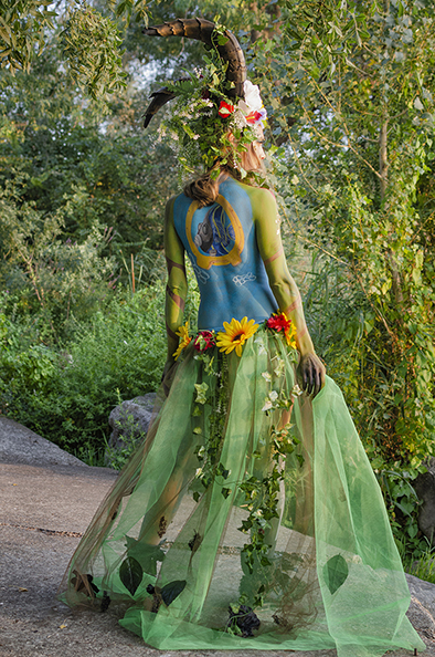 "La idea era transmitir la magnificencia de la naturaleza hasta mitad de cuerpo, con colores vivos, vibrantes y después, de cintura para abajo, mostrar cómo la contaminación, la basura y el fuego, entre otras cuestiones, se van comiendo esa naturaleza, ese brillo. Reflejamos también la muerte de los animales; de ahí el oso con medio rostro en esqueleto simulando la sequía, y las botas estaban llenas de musgo y flores negras. En la espalda, además, aparece la ventana de un submarino por la que se ve a un pez con una máscara que emula la contaminación del mar", afirma Maite, que se encargó de esta parte mientras que David se centró en el tocado de fantasía con el que reflejó "la grandeza de la naturaleza. Con los cuernos simulé a los animales y para recrear todo utilicé materiales naturales y vegetales".