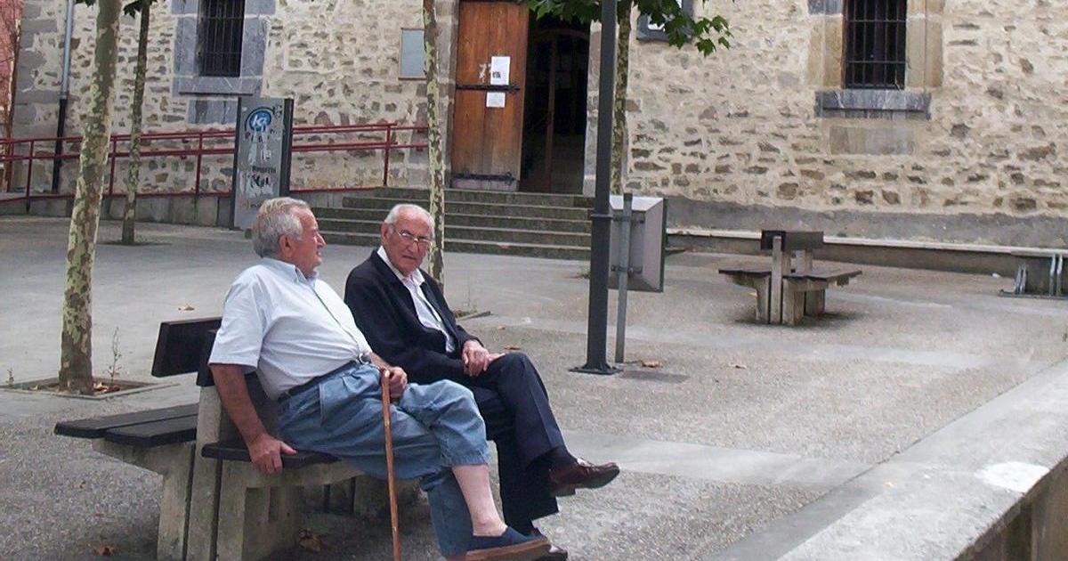 Dos hombres mayores conversando en el exterior de la Casa de Cultura de Amurrio
