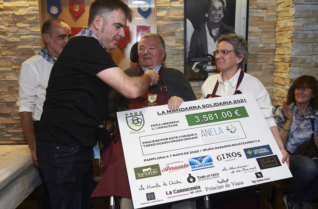 Han completado el aforo del comedor –114 personas– e incluso un par de cuadrillas se han quedado fuera. El Día del Socio que la Peña Oberena celebra el primer sábado de mayo tiene tirón. Más aún desde 2012, año en el que arrancó la iniciativa que le acompaña. Una Mandarra Solidaria que este sábado ha ido a parar a la Asociación Navarra de Esclerosis Lateral Amiotrófica (ANELA).