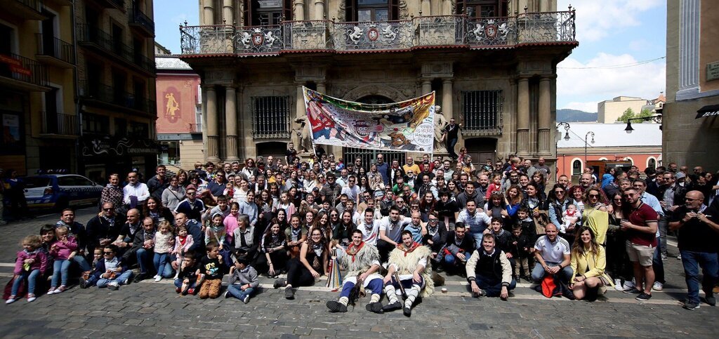 San Fermín Joaldunak, Txaranga Iraunkorrak y peña, por las calles de Pamplona. FOTO: cedida Alrededor de 200 personas han frente al consistorio en la foto de familia oficial, han regresado a su local, han comido y bebido y a la tarde más. De nuevo salida con la txaranga por las calles del Casco Antiguo de Pamplona y, por si acaso a alguien no le parece suficiente fiesta, una cena por cortesía de la peña en la zona del bar.