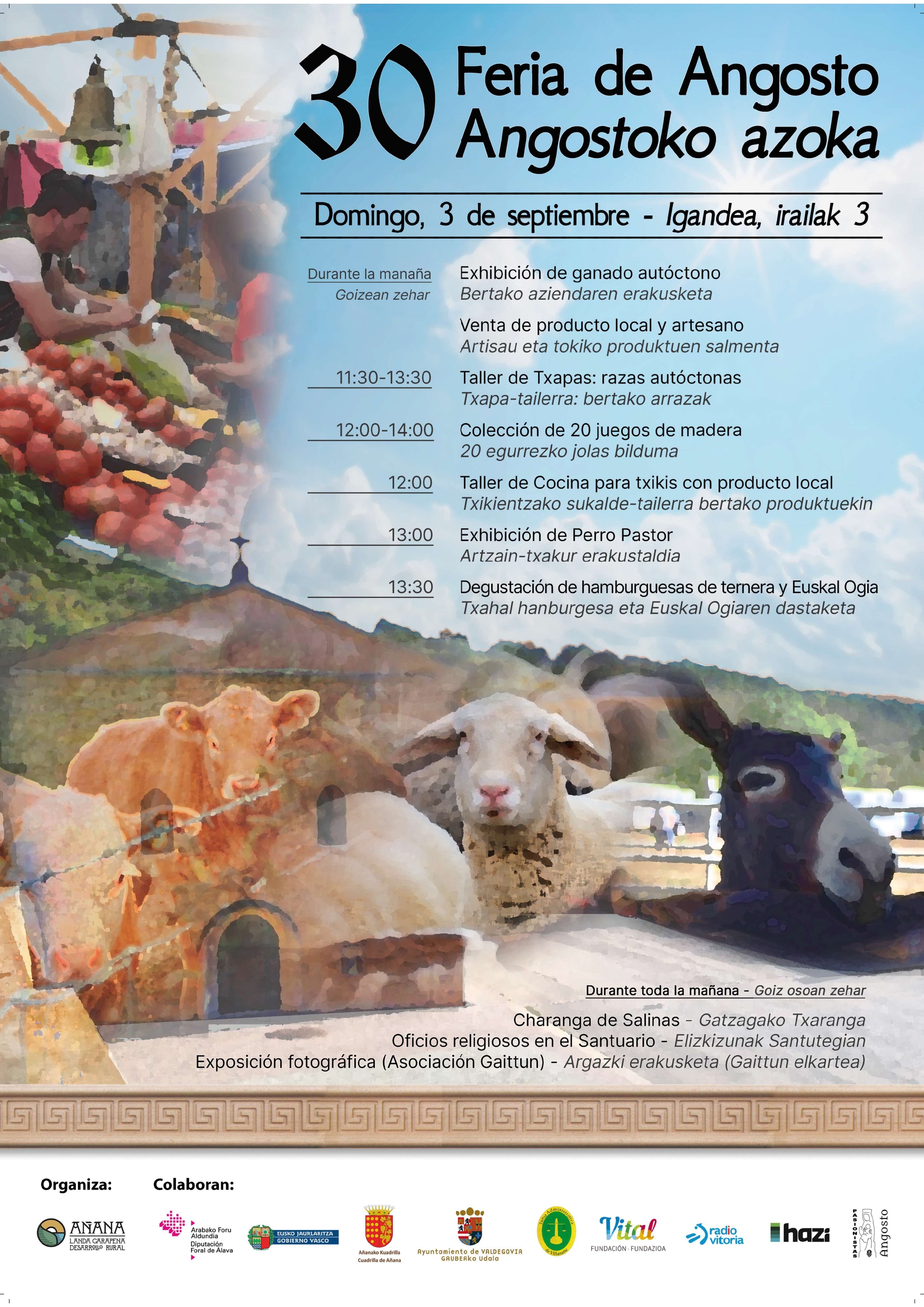 Este domingo el entorno del Santuario de Angosto será de nuevo testigo de la tradicional feria agroganadera que cumple este año su trigésima edición organizada por la Asociación de Desarrollo Rural de Añana. La feria tiene como objetivo principal dar a conocer a la ciudadanía la labor de las personas agricultoras, ganaderas y artesanas que cultivan, crían y elaboran productos de consumo en la Comarca de Añana y su entorno.