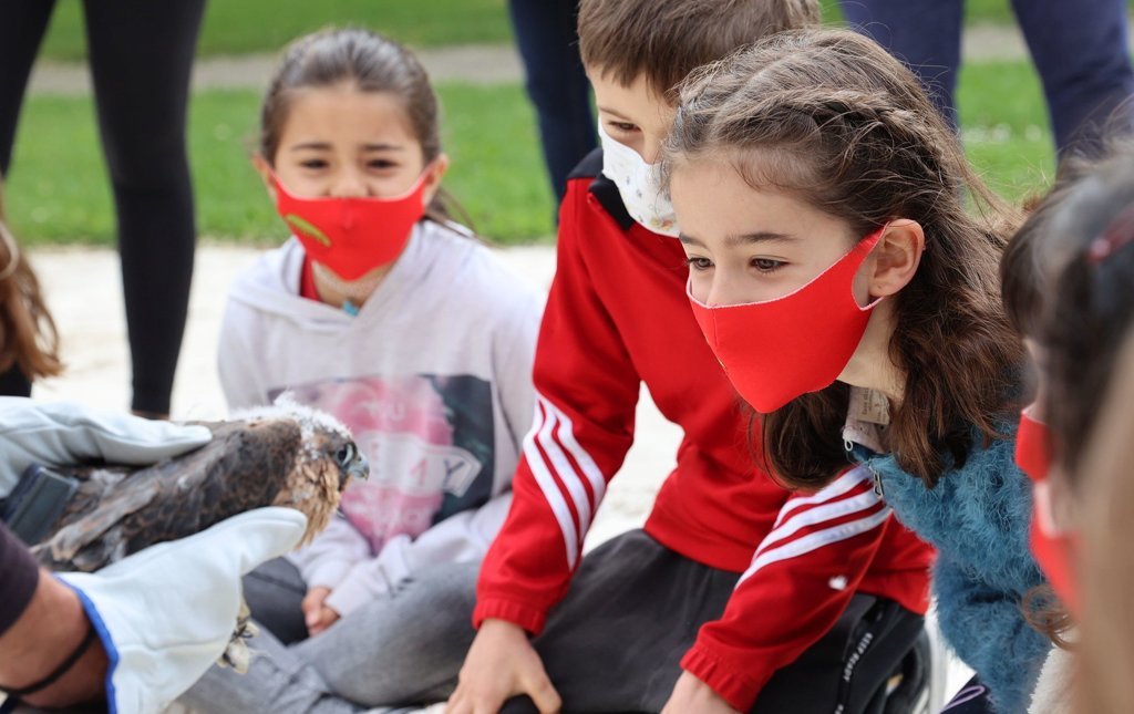 Ansoáin cuenta desde este martes por la mañana con dos nuevos vecinos que se encargarán, desde las alturas, de vigilar y mantener a raya la población de palomas en el municipio. Porque ni las trampas, ni el pienso anticonceptivo ni las redes han resultado ser, hasta ahora, métodos eficaces para lidiar con ellas pero, como en casi todo, las mejores soluciones son las que se basan –y de las que dispone– la propia madre naturaleza. Los alumnos y alumnas de tercero de Primaria del Colegio Público Ezkaba han conocido este martes de primera mano a estos visitantes con plumas, expertos cazadores capaces de superar los 200 kilómetros por hora cuando van a por sus presas.