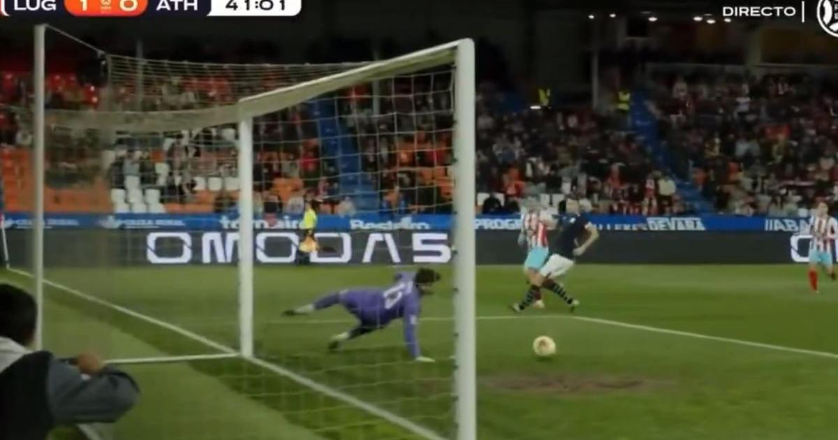 Pero no contaba con un delantero casi invisible que había dentro del área pequeña. Aunque el aspecto del césped del Anxo Carro, el estadio del Lugo, es bastante bueno, justo ahí había una zona en mal estado, lo que provocó que el balón cambiara de dirección y se introdujera en la portería, ante la incredulidad de Santos.