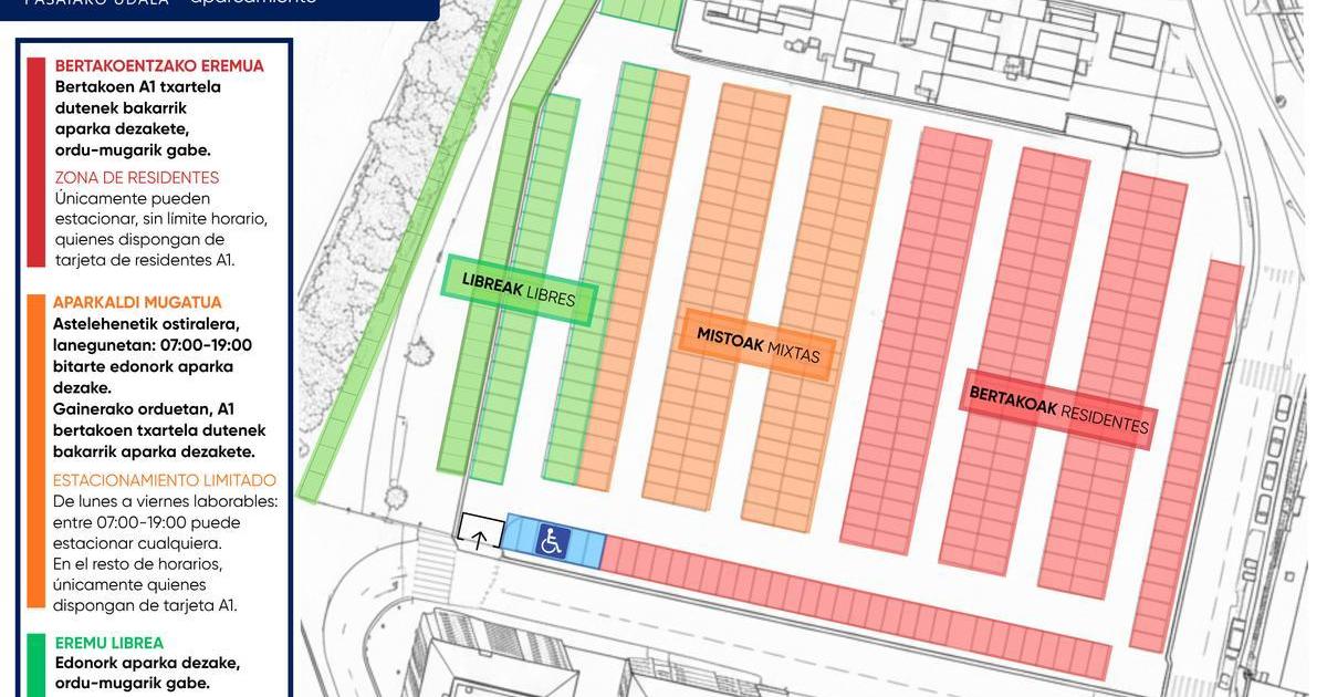 Por último, las cinco filas que se encuentran en el medio serán de uso mixto. En este caso, de lunes a viernes, en los días laborables, puede estacionar cualquiera entre las 7.00 y las 19.00 horas. Sin embargo, por la noche, a partir de las 19.00 y hasta la 7.00 horas, y los fines de semana el aparcamiento estará reservado para los residentes con tarjeta de Antxo, la A1.
