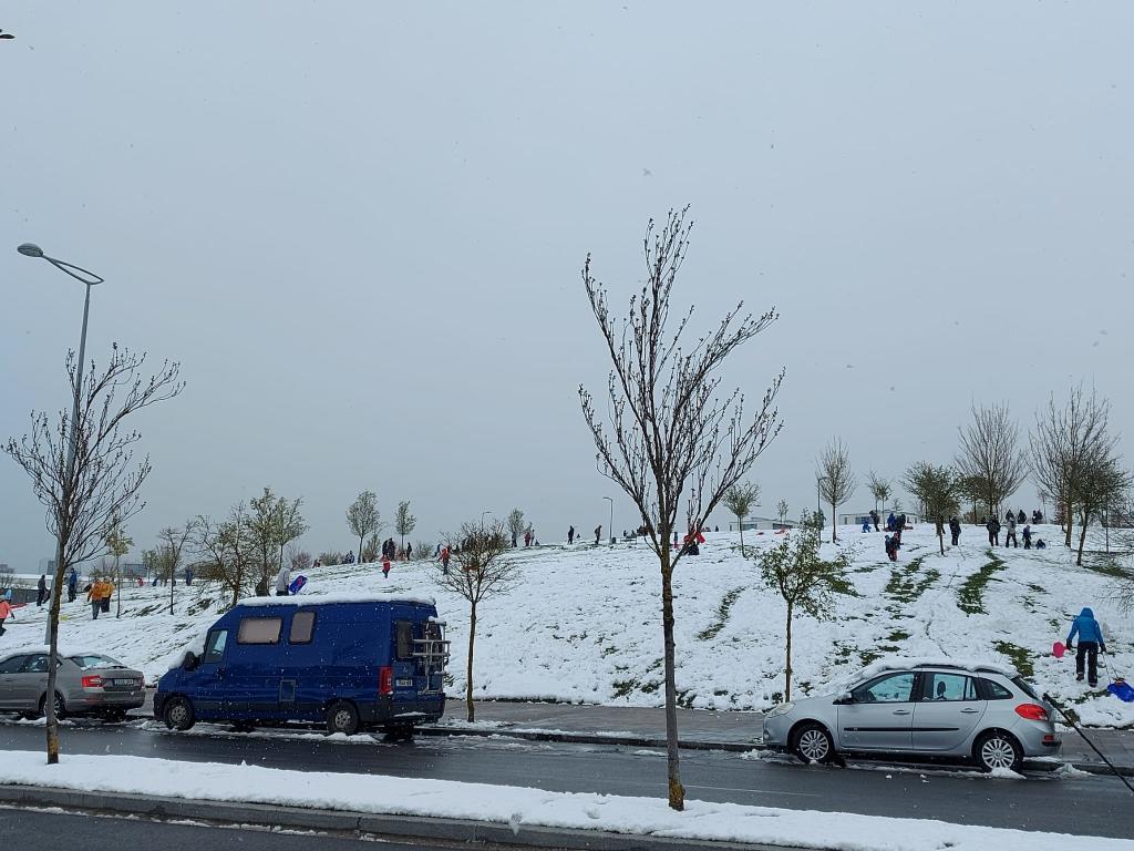 Muchos niños y mayores han vuelto a tirarse cientos de veces esta mañana en trineo en zonas verdes de la ciudad que han amenecido completamente blancas.