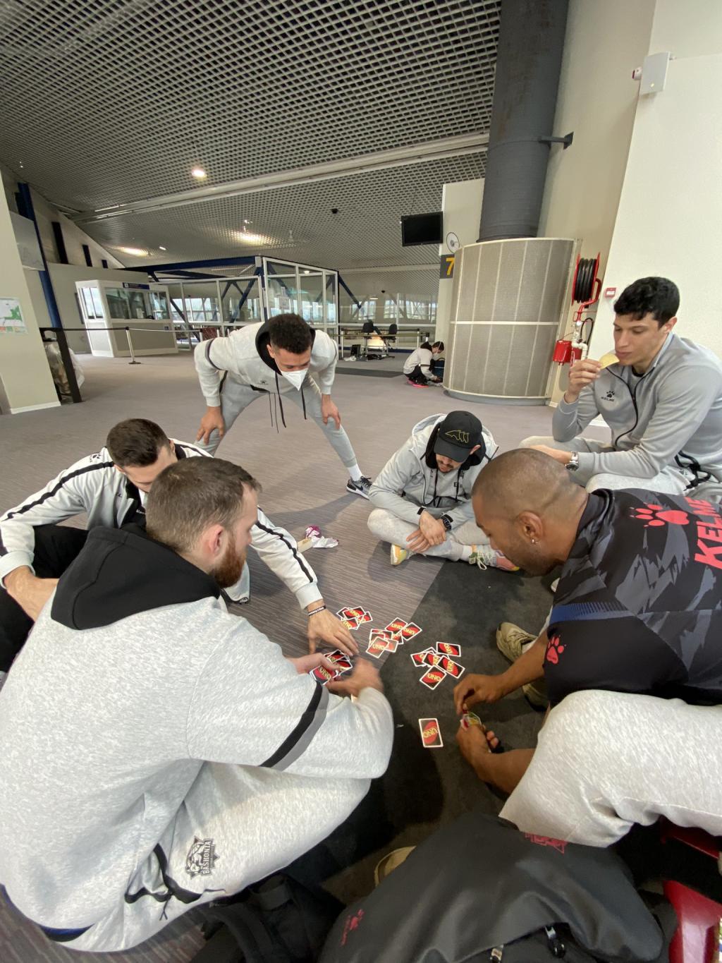 Antes de despegar, los jugadores de la plantilla azulgrana han decidido pasar las horas muertas de espera en el aeropuerto con el juego que está causando furor entre los pupilos de Neven Spahija: el Uno.