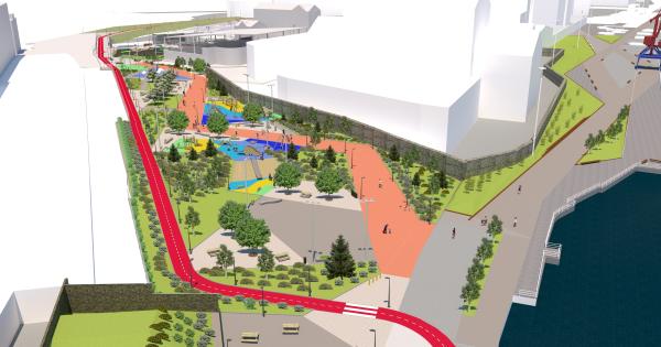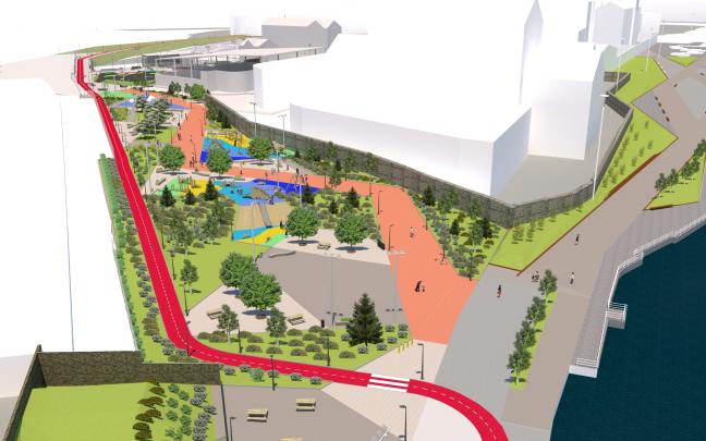En este sentido, se dará continuidad al bidegorri ejecutado en la fase anterior, junto a las vías de tren primero y a lo largo del muelle después. Desde este carril se podrá acceder al parque sobre la bicicleta pero la propia configuración del mismo instará a aparcar antes de meterse en zonas peatonales o de juegos.