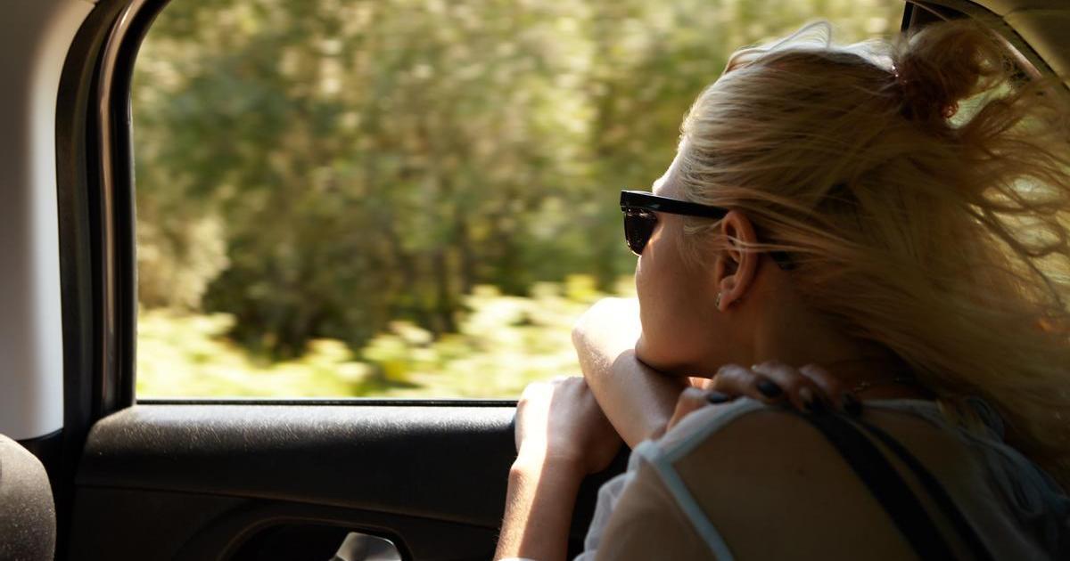 Mujer mira por la ventanilla del coche.