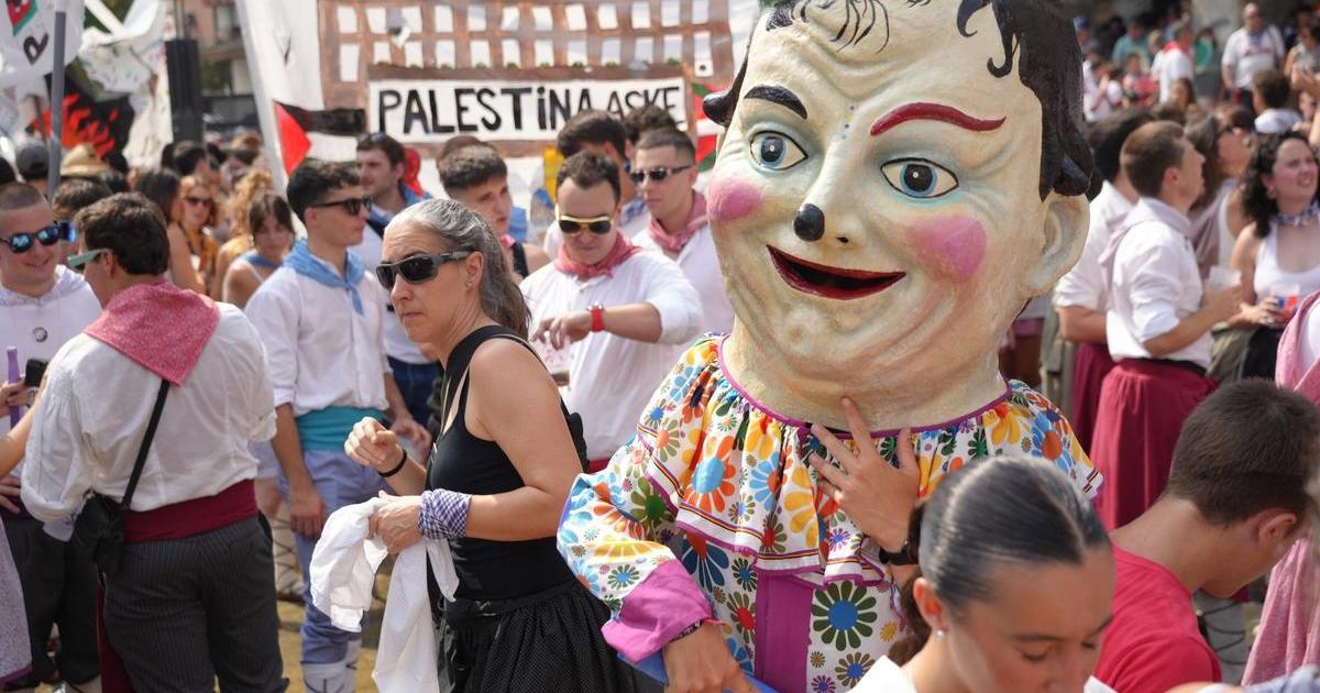 Volviendo a los instantes previos del txupinazo, en la Herriko Plaza, tampoco puede pasarse por alto el mensaje de solidaridad con Palestina que ha rodeado el evento y que ha quedado plasmado en una foto gigante que se han tomado las cuadrillas. Asimismo, todas sus pancartas lucían mensajes contra el genocidio israelí y a favor de los derechos del pueblo palestino, con el lema compartido: Para que la fiesta no sea cómplice del silencio.