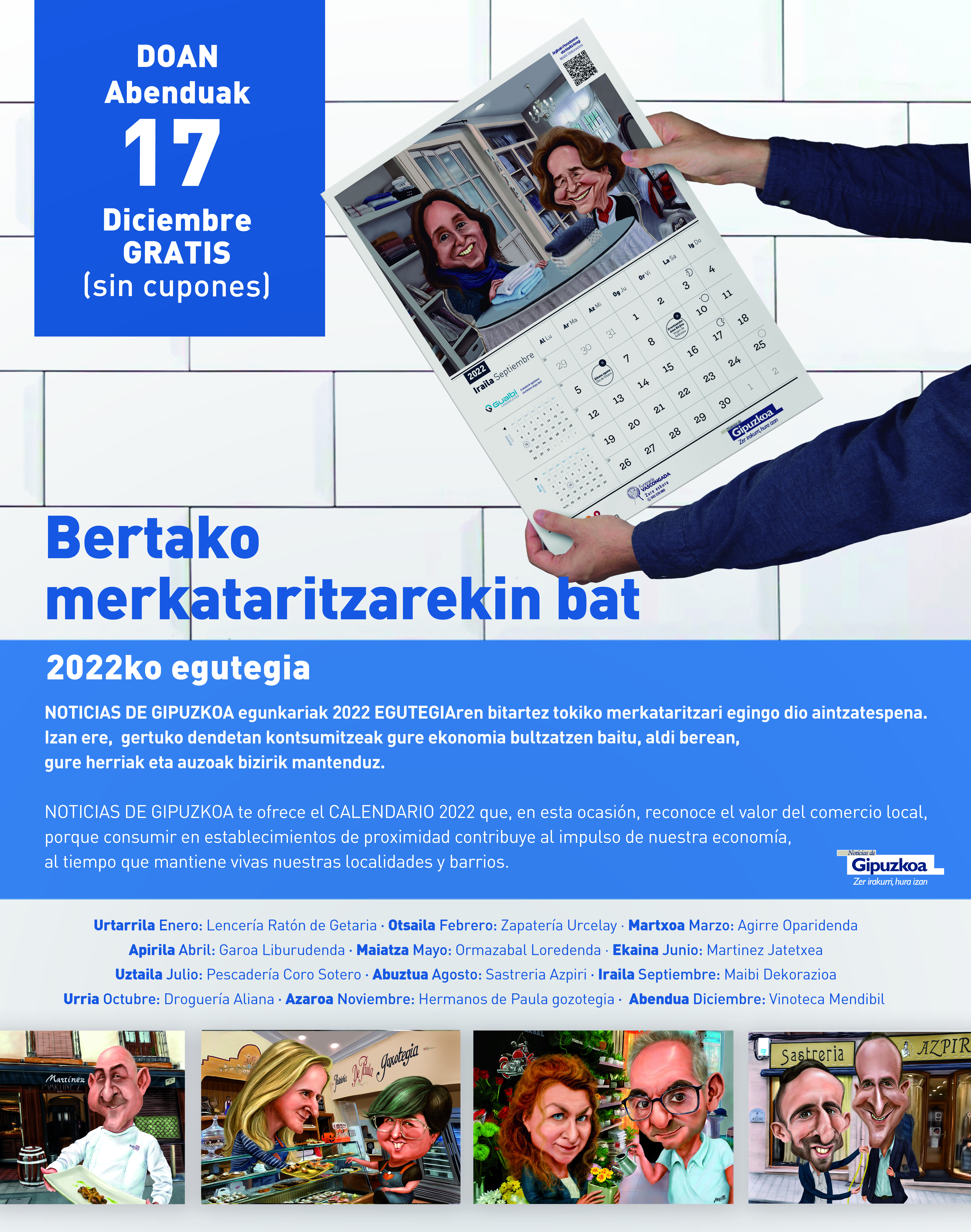 Noticias de Gipuzkoa egunkariak Gabonetako opari bat prestatu du irakurleentzat: 2022ko egutegia. Aurten bertako merkataritza izango da protagonista, gure lurraldeko dendariak.eta horiek egunero egiten duten lana azaleratu nahi izan dute Noticias Taldeko kideek Argoteren marrazkien bitartez.