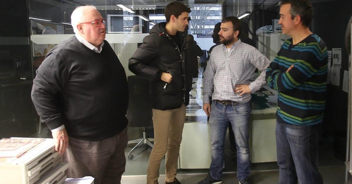 Iñaki de Mujika, tras entrevistar a Xabi Prieto, junto a los redactores Ramón Sánchez y Mikel Recalde, en la redacción de Noticias de Gipuzkoa.