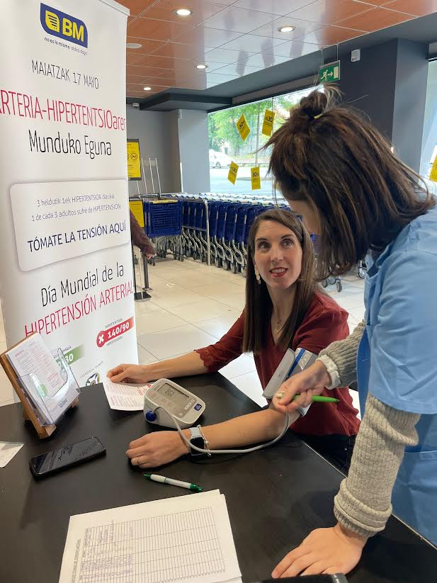 Hoy viernes día 17 de mayo, BM supermercados y el Colegio de Enfermería de Bizkaia han instalado un punto de prevención en la puerta del supermercado BM de Avd. Lehendakari Aguirre, nº98, en Bilbao. Todo el que se acerque podrá tomarse la tensión arterial de forma gratuita e informativa.