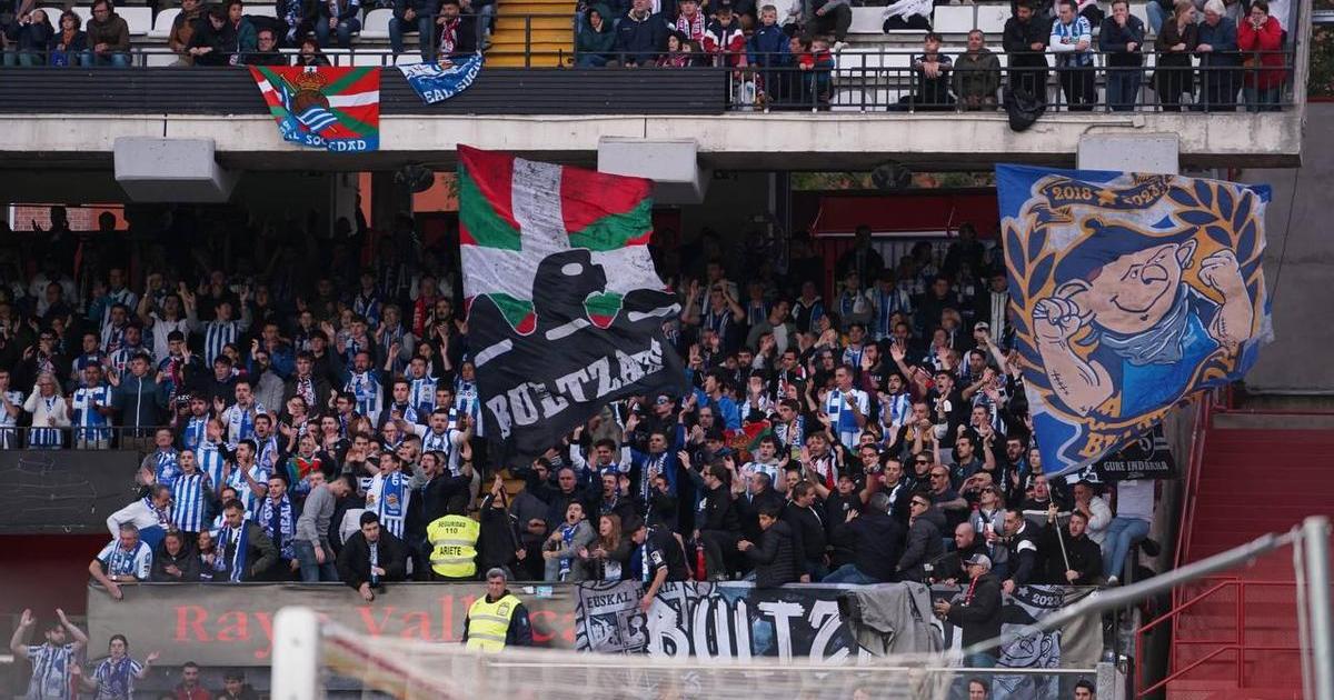 El colectivo Bultzada Txuriurdina, junto a otros seguidores realistas que acudieron a animar al equipo a Vallecas, el pasado mes de octubre. / BULTZADA TXURIURDINA / TWITTER
