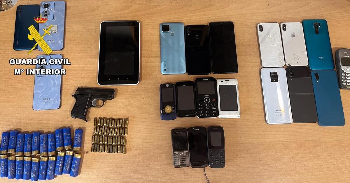 Una vez obtenidos todos los indicios necesarios, la Guardia Civil ha practicado la entrada y el registro de cuatro viviendas en las que se ha incautado una pistola semiautomática con abundante munición, dispuesta para efectuar fuego real, y un vehículo utilizados en la comisión del robo. Además, se ha recuperado una veintena de teléfonos móviles.