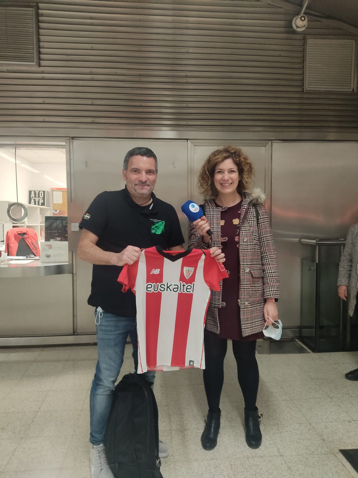 “EUSKAL TRENBIDEETAKO LANGILEAK MUGARIK GABE” Elkartea quiere equipar el primer equipo femenino de Cabo Verde. Se llamará ATHLETIC CLUB BILBAO y para ello piden camisetas rojiblancas de todas las tallas, que recogen en la oficina de Metro Bilbao en San Mamés. Nos lo ha contado, uno de sus organizadores, Txus Martín, voluntario de la asociación y conductor de Metro Bilbao