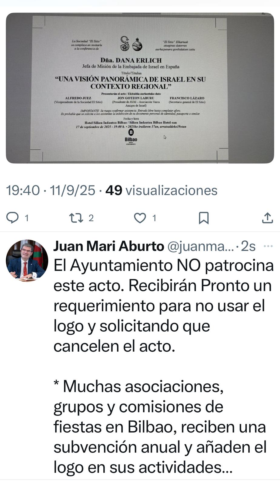 También el propio alcalde de Bilbao, Juan Mari Aburto, se había pronunciado, al respecto, negando que el Ayuntamiento patrocinara este foro, ya que en el anuncio del acto figuraba su logo. En este sentido, adelantaba que iba a remitir un requerimiento para que no se usara su logo y solicitando la cancelación del acto.