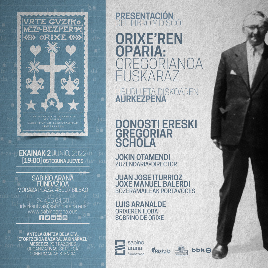 Juanjo Iturrioz y Jokin Otamendi cuentan en Onda Vasca que este jueves 2 de junio presentan "Regalo de Orixe: Gregoriano en euskera". El libro y disco elaborado por la asociación Donosti Ereski Gregoriar Schola. Será en la sede la Sabino Arana Fundazioa a las 19:00 horas.