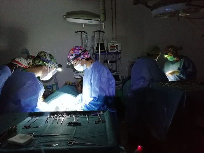 Operando a dos mesas sin luz, solo con frontales.