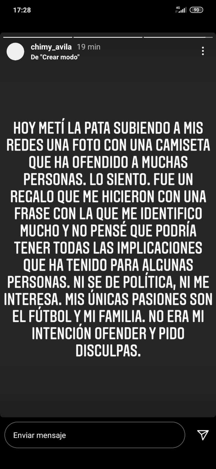 Tras el revuelo provocado por la difusión de la fotografía con la camiseta de Abascal, el futbolista argentino ha intentado apagar el incendio con una petición de disculpas en Instagram y ha explicado que la prenda fue un regalo del que ignoraba su alcance político. El Chimy ha destacado que se identifica con la frase que ilustra la camiseta, que para algunos tiene un fondo racista y una llamada a la violencia de extrema derecha.