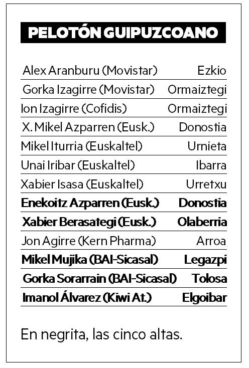 Suben cinco. Y se retiran cuatro. La nómina de corredores guipuzcoanos en el pelotón profesional incremntará con trece integrantes durante el presente 2023. Respecto al pasado 2022, han colgado la bicicleta los bergararras Mikel Aristi y Julen Irizar (Euskaltel-Euskadi). Aritz Bagües (Caja Rural) ha cambiado el culotte por el volante y pasa a ejercer de director en el filial de la escuadra navarra. Y Gaizka Gurrutxaga (Kiwi Atlántico) también ha abandonado la práctica del ciclismo. Mientras, cubren sus vacantes Xabier Berasategi, Enekoitz Azparren (ambos del Euskaltel-Euskadi), Mikel Mujika, Gorka Sorarrain (los dos del BAI-Sicasal) e Imanol Álvarez (Kiwi Atlántico).