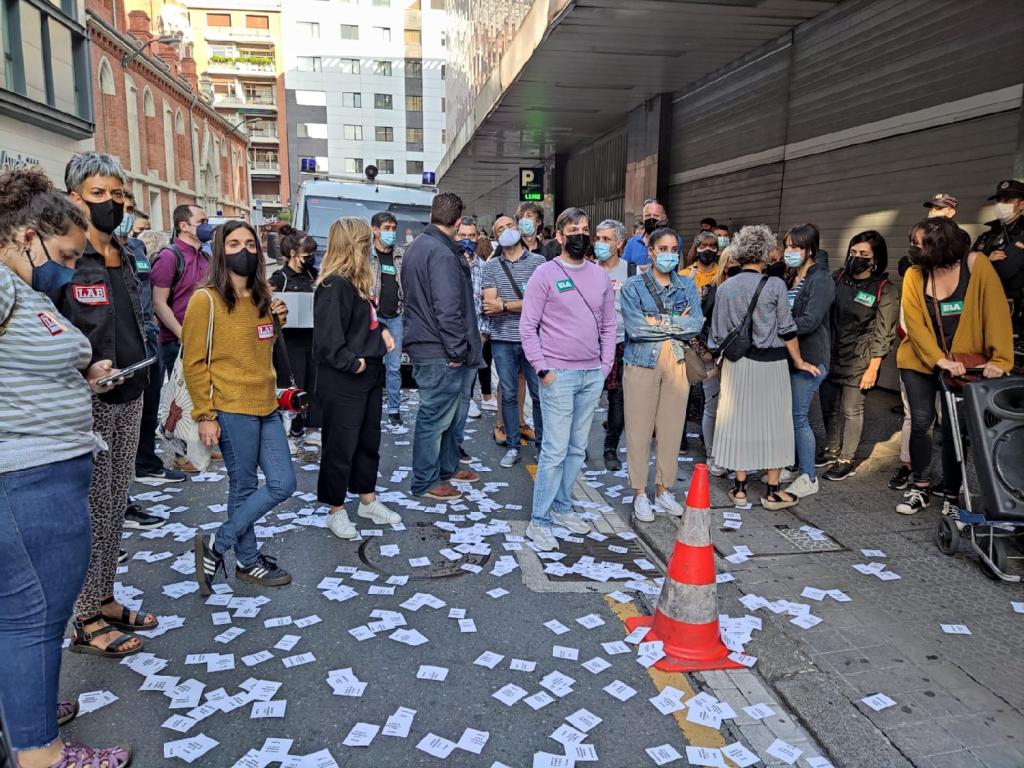 Piquetes informativos frente al Corte Inglés de Bilbao. Oskar González "Condiciones dignas para los trabajadores y trabajadoras del comercio". Una representante de ELA ha dicho a DEIA que van a moverse por todo Bilbao hasta el inicio de la manifestación que partirá a las 12.00 del Teatro Arriaga.