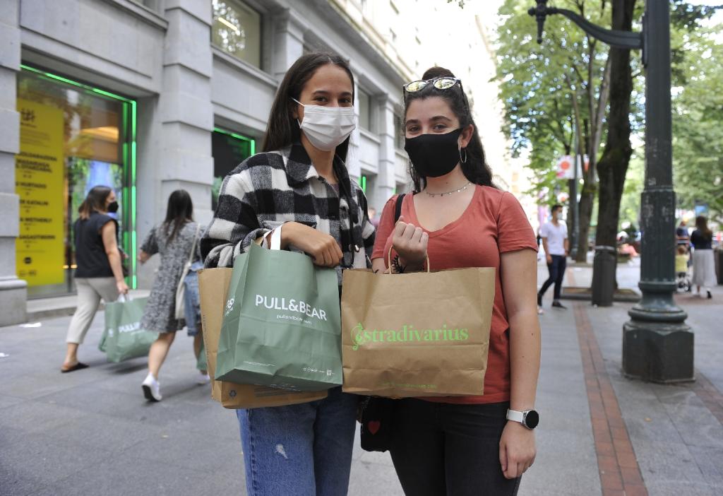 Ainhoa y Monse en las rebajas de Bilbao este viernes. O. González Camisetas a 7,95 euros; pantalones y cazadoras a 19,95 euros, sudaderas a 15,95 y sandalias 21,95 euros... Las baldas y perchas de los comercios en la capital vizcaina lucen llamativos carteles con "atractivos" descuentos que han motivado a personas como a la joven Laura Martínez de Bilbao. Ella es una de las que ha aprovechado este adelanto de rebajas para darle un cambio a su vestuario después de meses sin apenas consumir. "La verdad es que el año pasado no me compré nada y este año tengo ganas de comprarme cositas. Ahora a ver si hace buen tiempo para lucirlo", ha contado. Por su parte, Jone y Eiharne, amigas de Sestao y de Bilbao se han ido de rebajas este viernes, pero todo lo que se han comprado ya es de la nueva temporada. "Lo que nos ha gustado no tenía rebaja. Lo que hemos comprado son cositas para ir de vacaciones", ha dicho Jone.