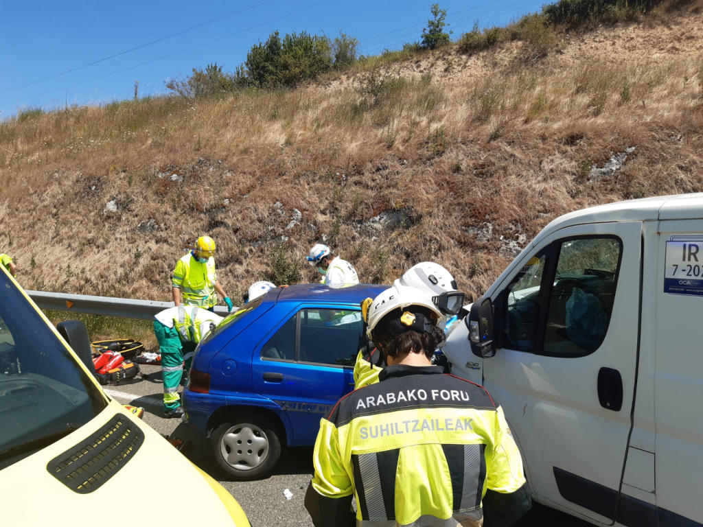 En el turismo, un Citroën Saxo, viajaba una mujer de 46 años, que tuvo que ser rescatada por los bomberos de Nanclares de la Oca y trasladada al centro hospitalario de Txagorritxu con heridas de diversa consideración.
