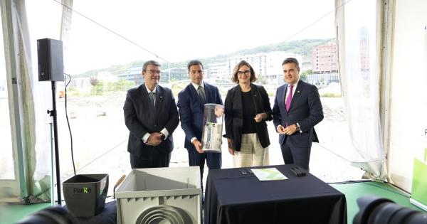 El Lehendakari, Imanol Pradales, la diputada general de Bizkaia, Elixabete Etxanobe, y el alcalde de Bilbao, Juan Mari Aburto, junto al consejero de Industria, Mikel Jauregi, fueron este pasado lunes los encargados de colocar la primera piedra de este edificio, propiedad del Parque Tecnológico de Euskadi.