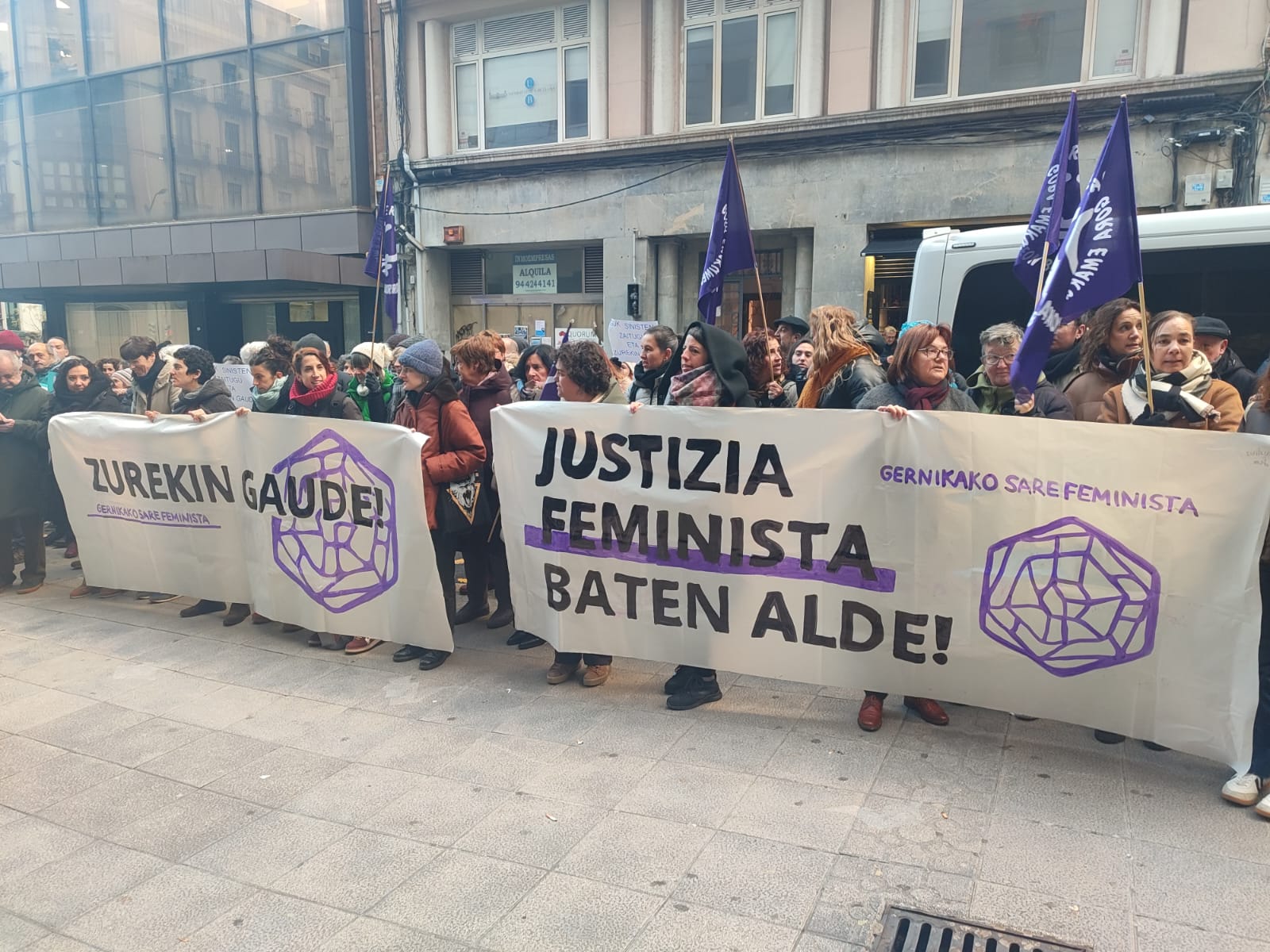 A las puertas de la Audiencia de Bizkaia se han concentrado un centenar de personas convocadas por Gernikako Sare Feminista, con tres pancartas en las que se podían leer estos lemas: Guk sinisten zaituguZurekin Gaude y Justicia Feminista Baten Alde".