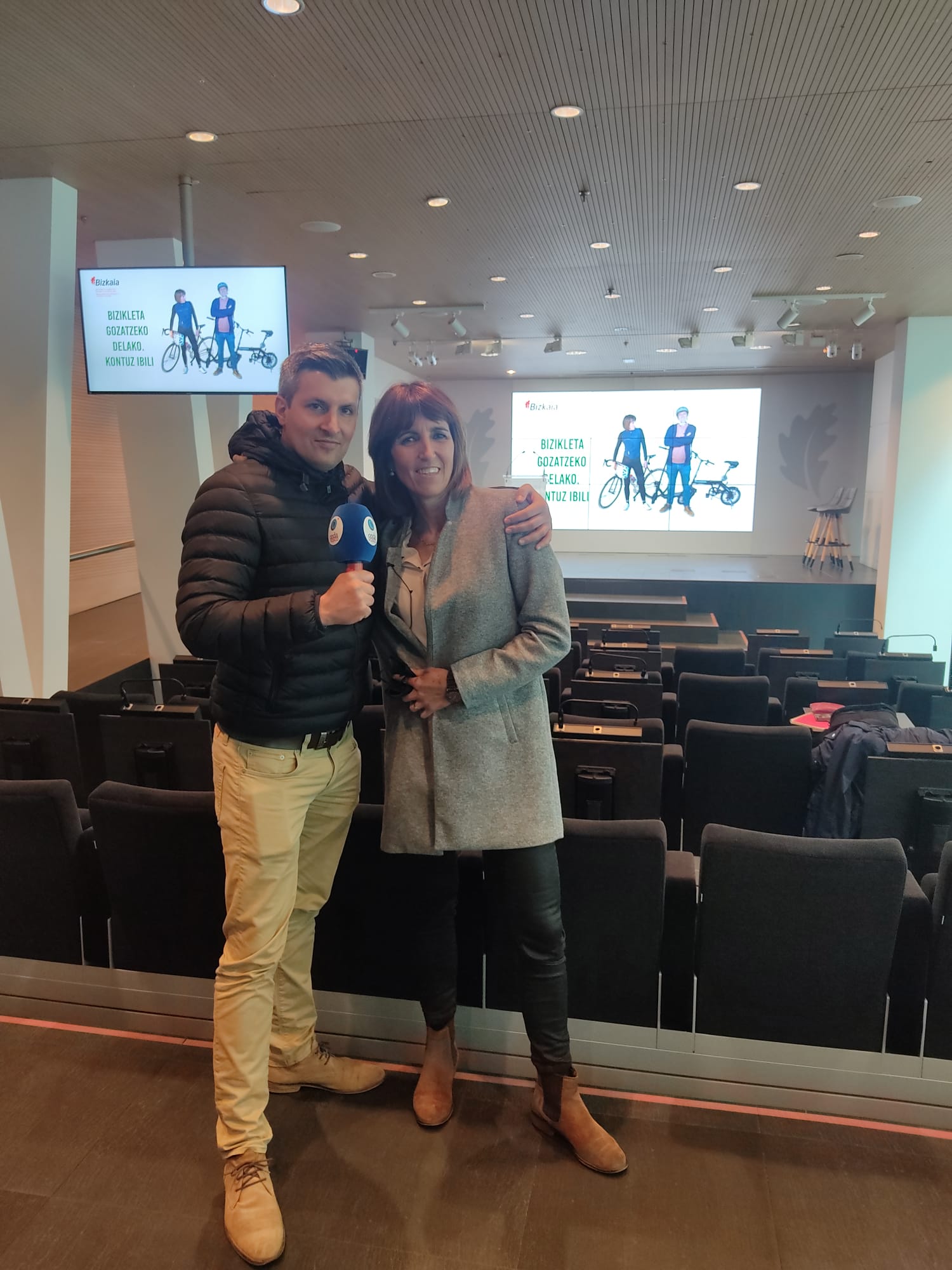 La ex ciclista Joane Somarribia y el actor Javier Antón han presentado la campaña para concienciar sobre el uso correcto de bicicletas y patinetes en las vías públicas "Si circulas en bici o en patín, cuidadín"