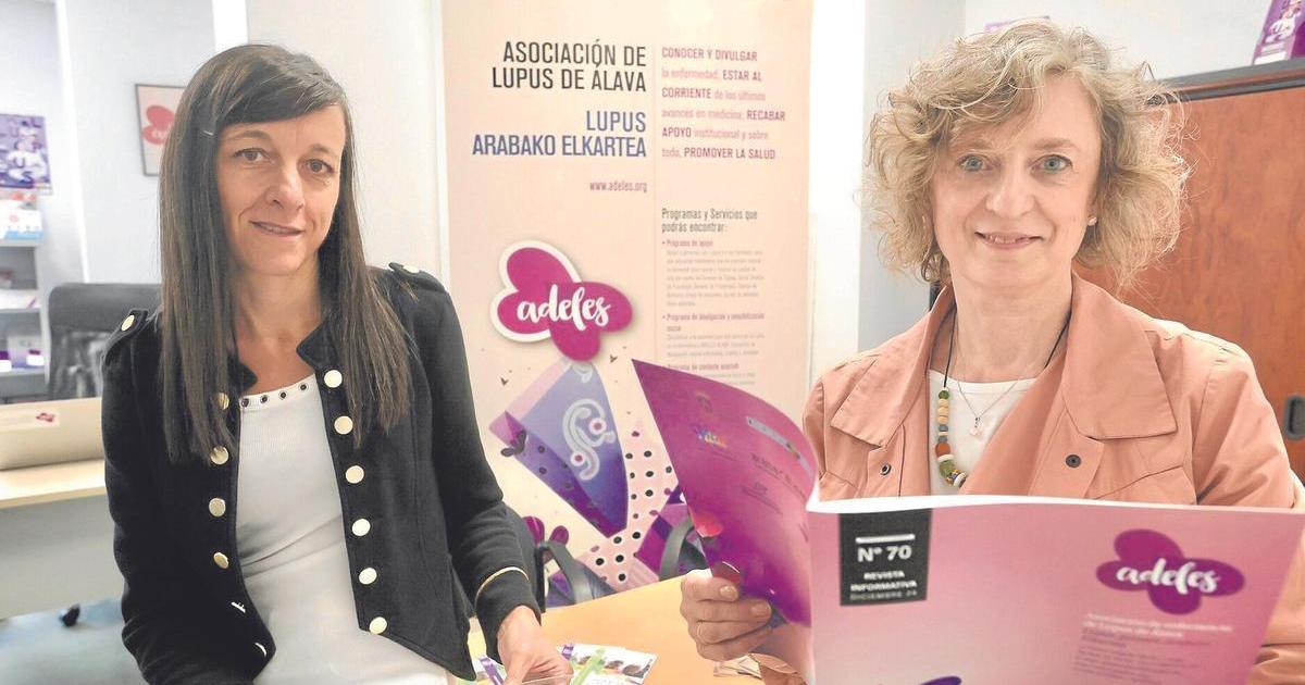 “Al recibir el diagnóstico, pregunté en la consulta si había alguna asociación de lupus en la que me pudiera apoyar. Al decirme que sí, lo primero que hice al salir fue acudir a la asociación Adeles, donde me sentí apoyada y comprendida y, pese a lo duro de la situación, fue el punto de partida para abordar una nueva etapa”. Sagrario Mesonero Barbero, actualmente presidenta voluntaria de la asociación Adeles Álava y socia desde hace 28 años, convive con una enfermedad que apenas padecen unas 210 de cada 100.000 personas en el conjunto del Estado. El lupus es una patología autoinmune y crónica que puede afectar a cualquier parte del cuerpo (articulaciones, piel y órganos internos). Ha ganado visibilidad en los últimos años, pero sigue siendo una gran desconocida en la sociedad. Aunque el Lupus Eritematoso Sistémico (LES) puede manifestarse a cualquier edad, lo más frecuente suele ser que aparezca en mujeres entre los 15 y 40 años. El 81% de los pacientes muestra síntomas de fatiga crónica, el 15% sufre ataques epilépticos y un 90% puede llegar a tener fiebres “inexplicables” por encima de los 38 grados, según informa Adeles. Otros síntomas comunes son lesiones en la piel, dolor e inflamación muscular y articular, sensibilidad extrema al sol, pérdida de peso… Vivir con lupus no es sencillo. Y no siempre se entiende por parte del resto, porque sus efectos no son fácilmente perceptibles. La asociación alavesa hace un frente común desde hace más de tres décadas con familiares, afectados y amigos para ayudar a convivir con una enfermedad que no se contagia ni tiene un origen infeccioso o canceroso. Su batería de objetivos consiste, principalmente, en “dar a conocer y divulgar la enfermedad, estar al corriente de los últimos avances médicos y recabar apoyos de las distintas instituciones”. Adeles Álava cuenta con 120 personas socias, de las cuales 80 son afectadas y el resto familiares. Mari Mar García Sancha, trabajadora social de la entidad, colabora profesionalmente con este colectivo desde 2012, ofreciendo atención individual y familiar para identificar los problemas de cada persona afectada por lupus. “Poder ofrecer una serie de servicios y actividades a través de la asociación es muy importante para mejorar la calidad de vida de la gente que llama a nuestra puerta”, asegura. Ella trabaja “mano a mano” con voluntarios, socios y profesionales que mantienen vivo el tejido asociativo de Adeles. Sagrario Mesonero y Mari Mar García responden conjuntamente en nombre de Adeles Álava a las preguntas de la entrevista.